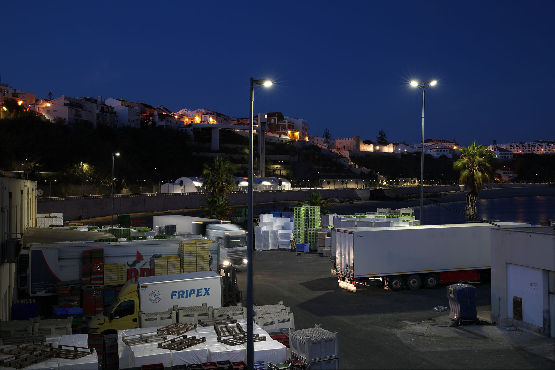 Die OMNIstar (128 LEDs), installiert auf zwölf Meter hohen Säulen, beleuchtet die Häfen, während die Zufahrtsstraßen von der Nano 2 LED (24 LEDs) beleuchtet werden. Die Leuchten sorgen für ein helles weißes Licht und damit für perfekte Sicht an dunklen Abenden. Nachts werden sie gedimmt, um den Energieverbrauch auf ein Minimum zu reduzieren und eine sichere Umgebung zu gewährleisten.